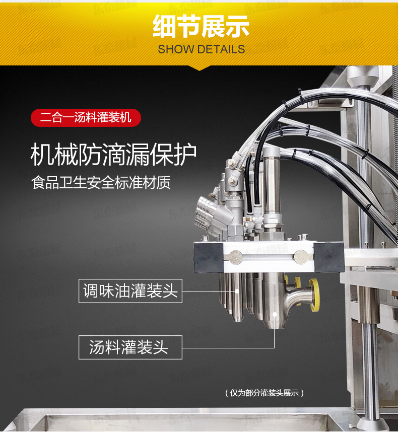 1.灌裝機(jī)在參考國外同類產(chǎn)品的基礎(chǔ)上進(jìn)行改良設(shè)計,特制湯料、調(diào)味油灌裝頭,機(jī)械防滴漏保護(hù),在灌裝過程中不會污染包裝容器。