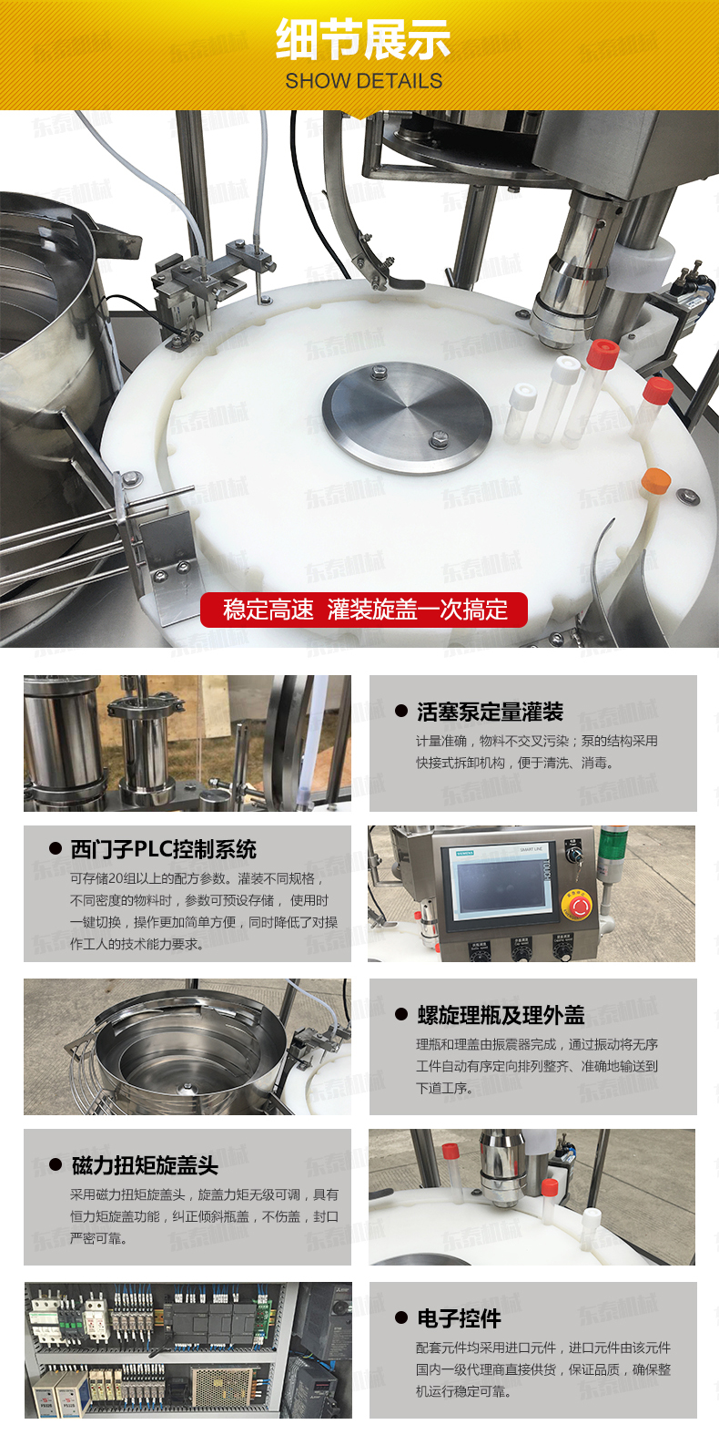 6、采用磁力扭矩旋蓋頭,旋蓋力矩無級可調,具有恒力矩旋蓋功能,糾正傾斜瓶蓋,不傷蓋,封口嚴密可靠;