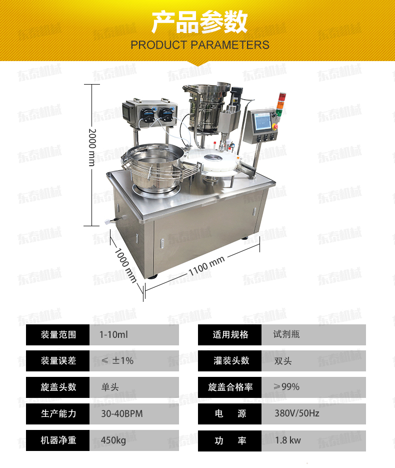 設備簡介: 本機是在引進和吸收國外技術的基礎上,由我公司自主研發的一款IVD診斷試劑灌裝旋蓋一體機,能同時完成自動理瓶、自動上瓶、定量灌裝、自動理蓋、上蓋和旋蓋封口等動作。本機采用日本高