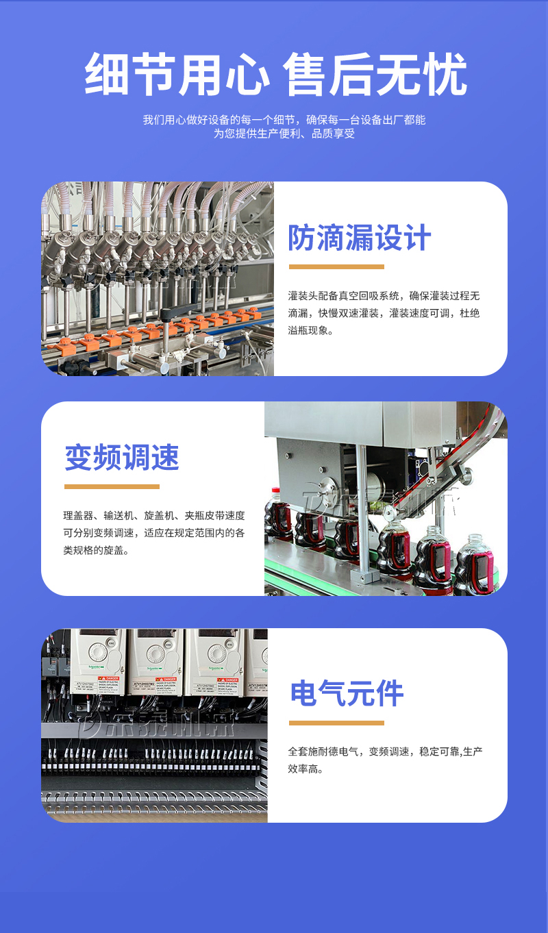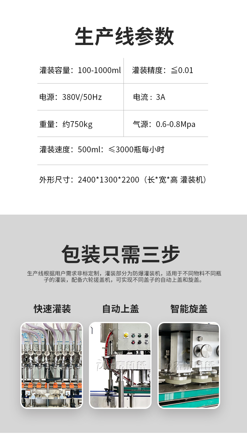 電子量杯感應(yīng)直列式灌裝機(jī),是目前國(guó)內(nèi)液體灌裝的高端產(chǎn)品,自動(dòng)化程度高,灌裝計(jì)量精確,適用于塑料瓶、玻璃瓶等各種幾何形狀的瓶型的不含氣體的酒水、飲料、調(diào)味品及其他溶液的定量灌裝。機(jī)器采用觸摸屏代替?zhèn)鹘y(tǒng)的按鈕操作,操作簡(jiǎn)單、方便、直觀。科技含量高。機(jī)器灌裝計(jì)量可通過(guò)觸摸屏對(duì)灌裝時(shí)間的調(diào)整實(shí)現(xiàn)不同計(jì)量灌裝,方便操作者使用。