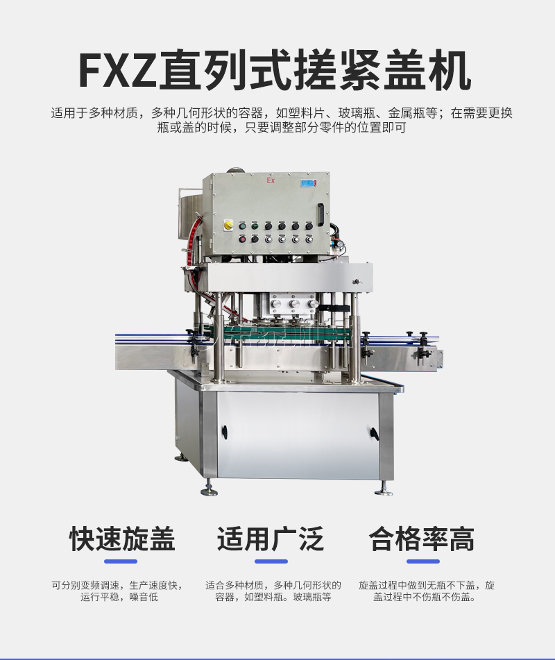 本機(jī)適用于多種材質(zhì),多種幾何形狀的容器,如塑料片、玻璃瓶、金屬瓶等;在需要更換瓶或蓋的時(shí)候,只要調(diào)整部分零件的位置即可,無(wú)需更換任何配件;在旋蓋過(guò)程中可以做到無(wú)瓶不下蓋。理蓋器、輸送機(jī)、旋蓋機(jī)、夾瓶皮帶速度可分別變頻調(diào)速,適應(yīng)在規(guī)定范圍內(nèi)的各類(lèi)規(guī)格的旋蓋。(附:特殊規(guī)格定制即可)
