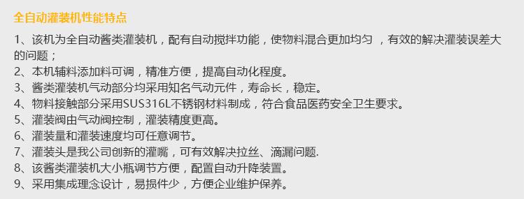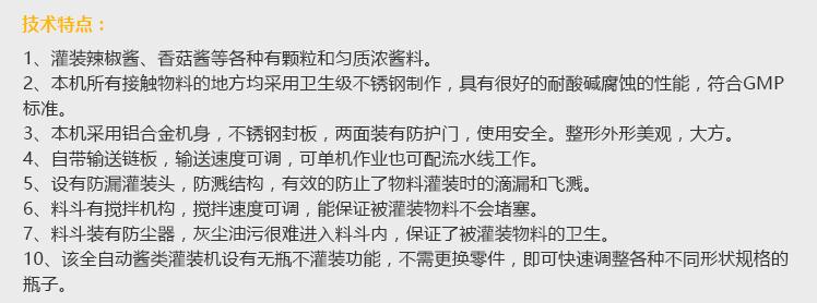 灌裝機采用活塞式灌裝原理,適用于調味品中帶顆粒并且濃度較大的辣椒醬、豆瓣醬、花生醬、香菇醬、果醬、牛油火鍋底料、紅油火鍋底料、蝦醬等較為粘稠醬類的灌裝。