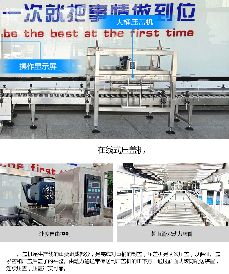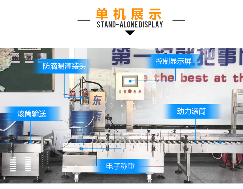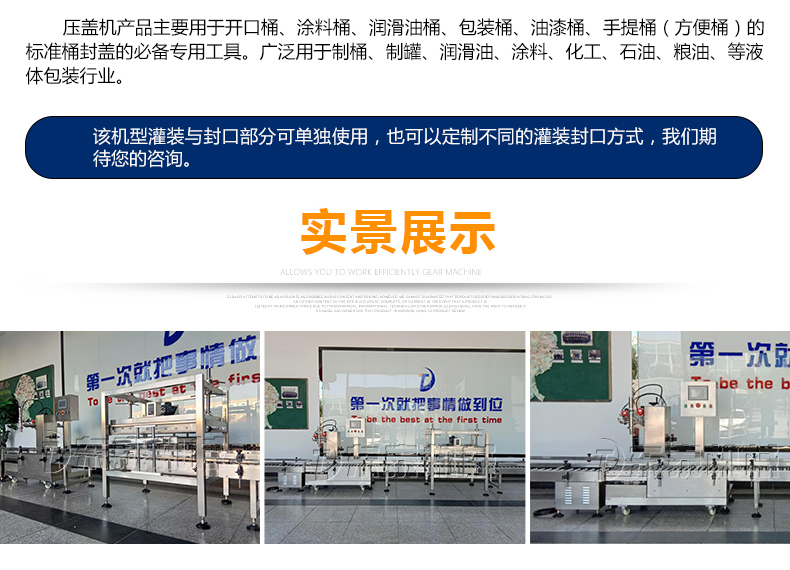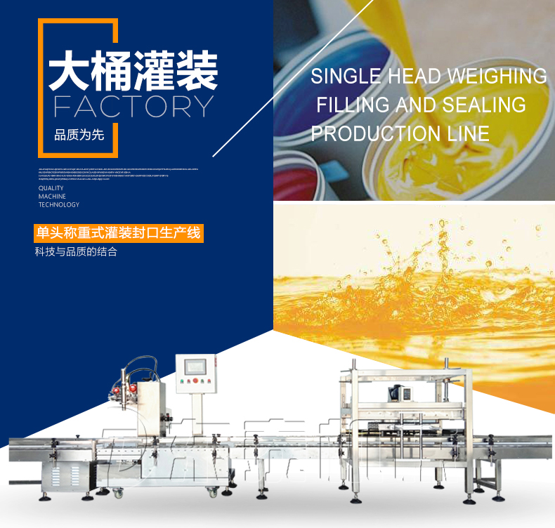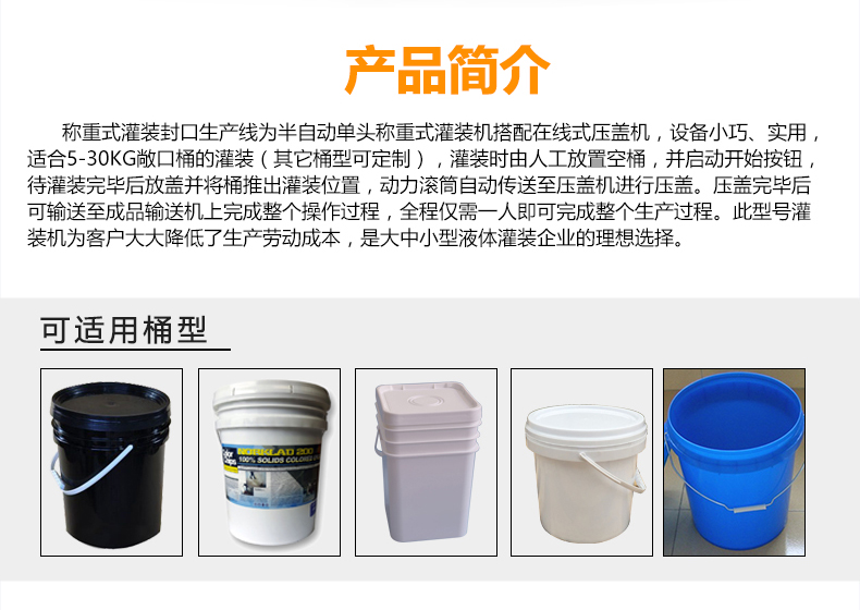 稱重式灌裝封口生產線為半自動單頭稱重式灌裝機搭配在線式壓蓋機,設備小巧、實用適合5-30KG敞口桶的灌裝(其它桶型可定制),灌裝時由人工放置空桶,并啟動開始按鈕,待灌裝完畢后放蓋并將桶推岀灌裝位置,動力滾筒自動傳送至壓蓋杋進行壓蓋。壓蓋完畢后可輸送至成品輸送機上完成整個操作過程,全程僅需一人即可完成整個生產過程。此型號灌裝機為客戶大大降低了生產勞動成本,是大中小型液體灌裝企業的理想選擇。